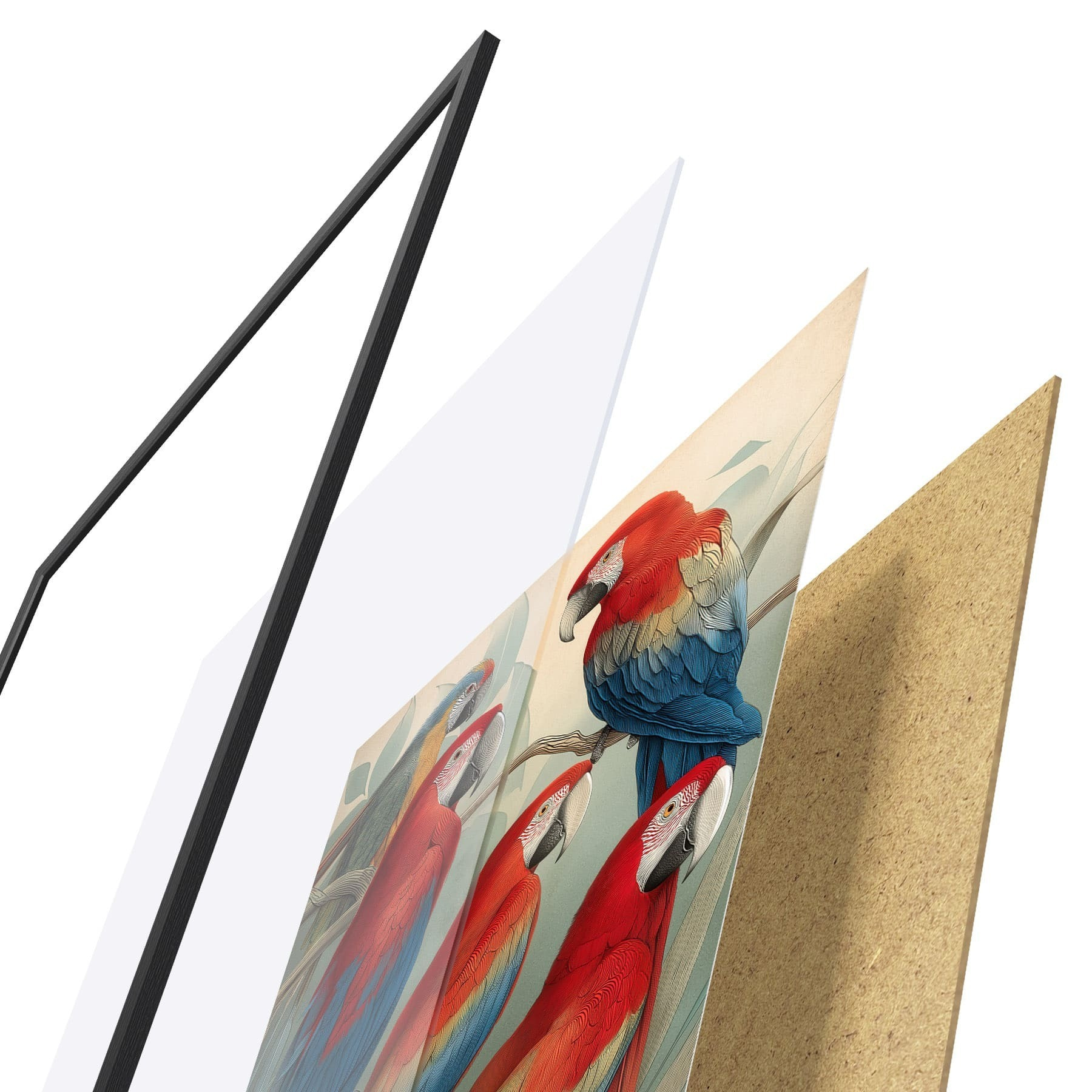 Plakat składa się z ramy, pleksi, wydrukowanego obrazu i podkładu z płyty wiórowej. Plakat można natychmiast zawiesić na ścianie dzięki uchwytom z tyłu.