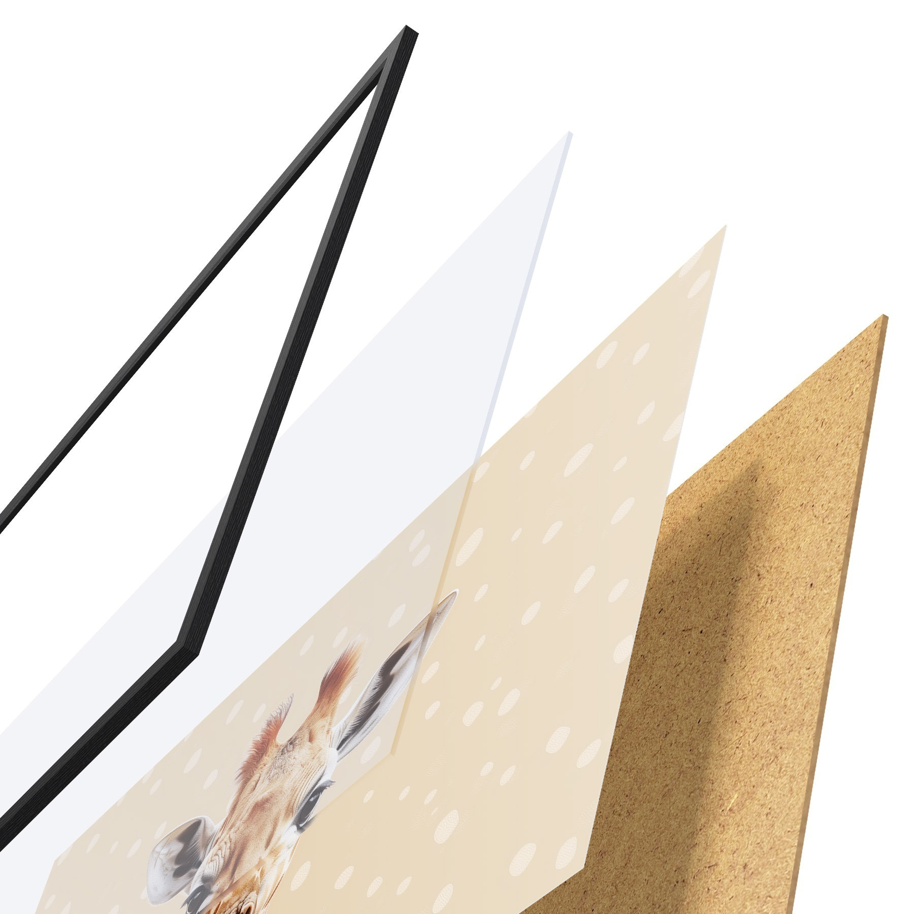 Plakat składa się z ramy, pleksi, wydrukowanego obrazu i podkładu z płyty wiórowej. Plakat można natychmiast zawiesić na ścianie dzięki uchwytom z tyłu.