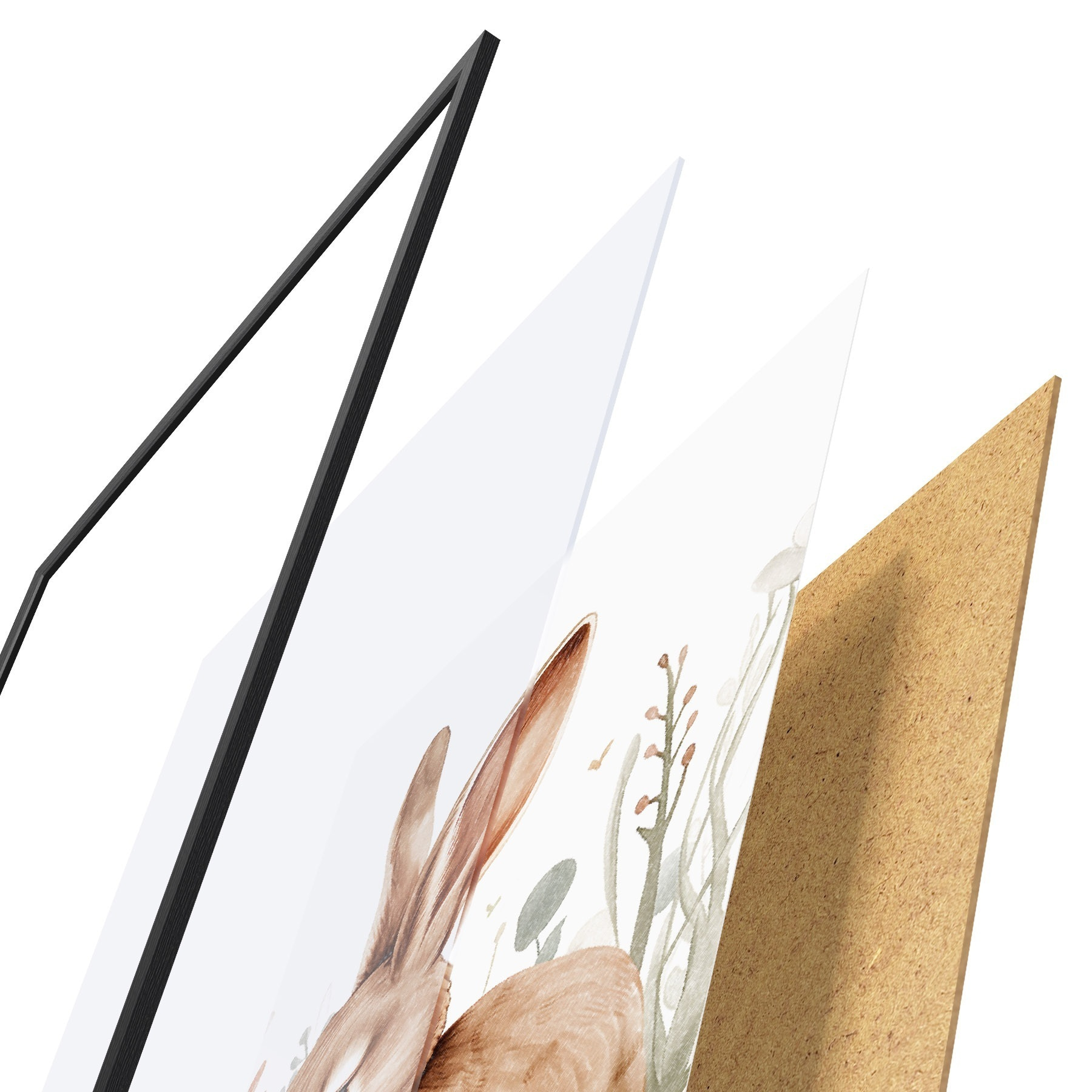Plakat składa się z ramy, pleksi, wydrukowanego obrazu i podkładu z płyty wiórowej. Plakat można natychmiast zawiesić na ścianie dzięki uchwytom z tyłu.
