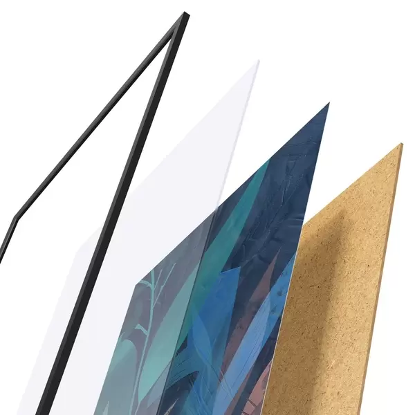 Plakat składa się z ramy, pleksi, wydrukowanego obrazu i podkładu z płyty wiórowej. Plakat można natychmiast zawiesić na ścianie dzięki uchwytom z tyłu.