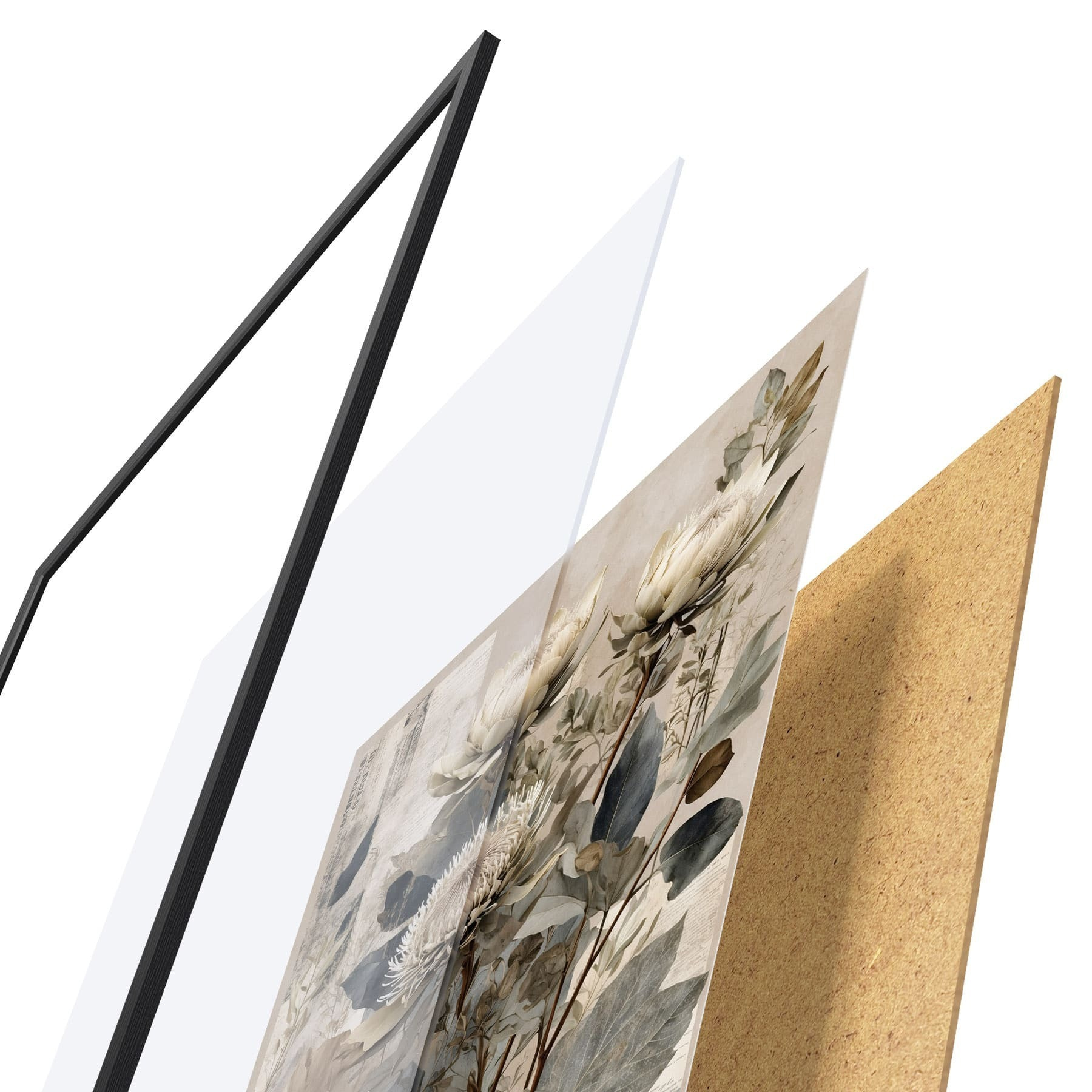 Plakat składa się z ramy, pleksi, wydrukowanego obrazu i podkładu z płyty wiórowej. Plakat można natychmiast zawiesić na ścianie dzięki uchwytom z tyłu.