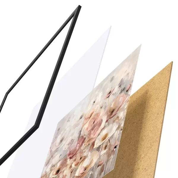Plakat składa się z ramy, pleksi, wydrukowanego obrazu i podkładu z płyty wiórowej. Plakat można natychmiast zawiesić na ścianie dzięki uchwytom z tyłu.