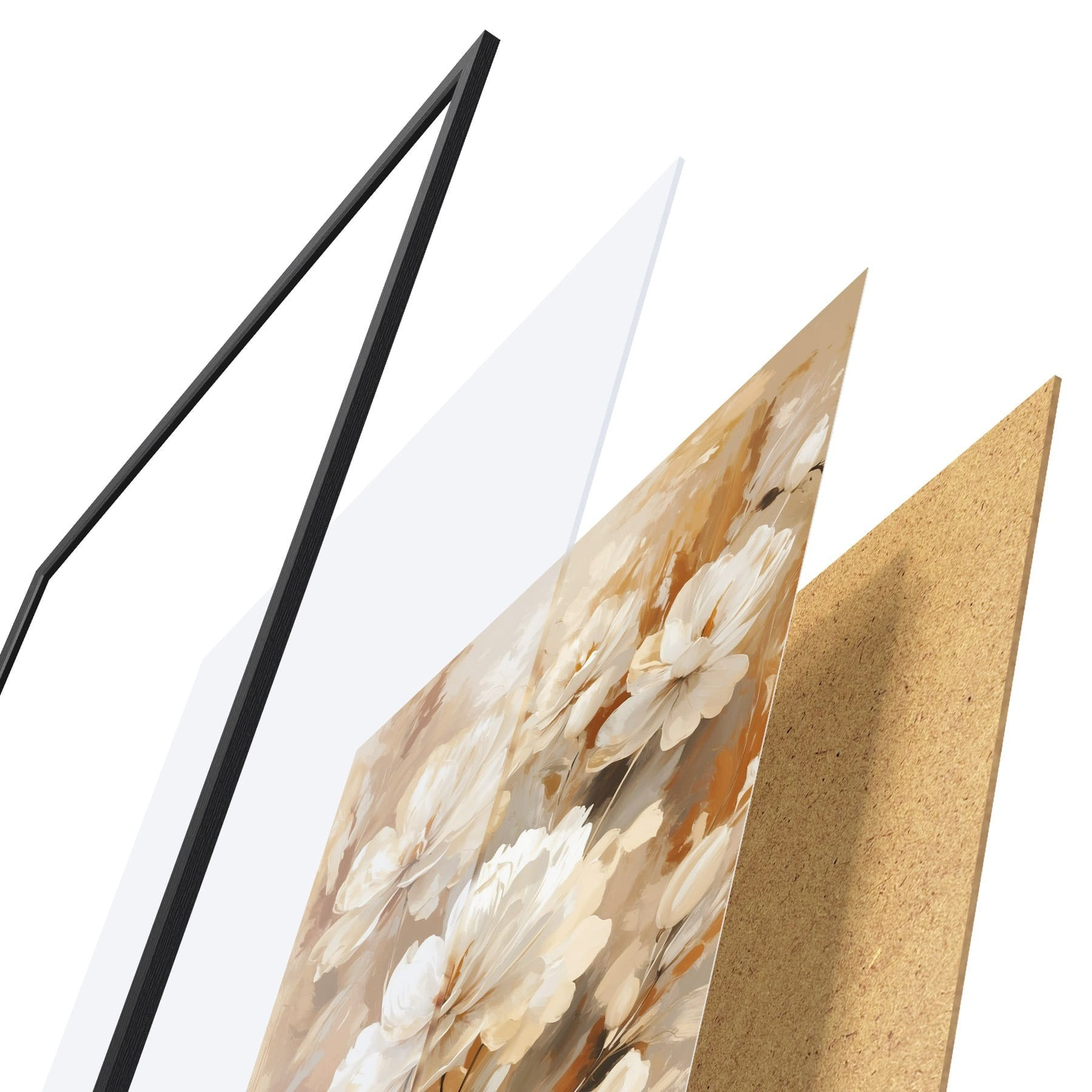 Plakat składa się z ramy, pleksi, wydrukowanego obrazu i podkładu z płyty wiórowej. Plakat można natychmiast zawiesić na ścianie dzięki uchwytom z tyłu.