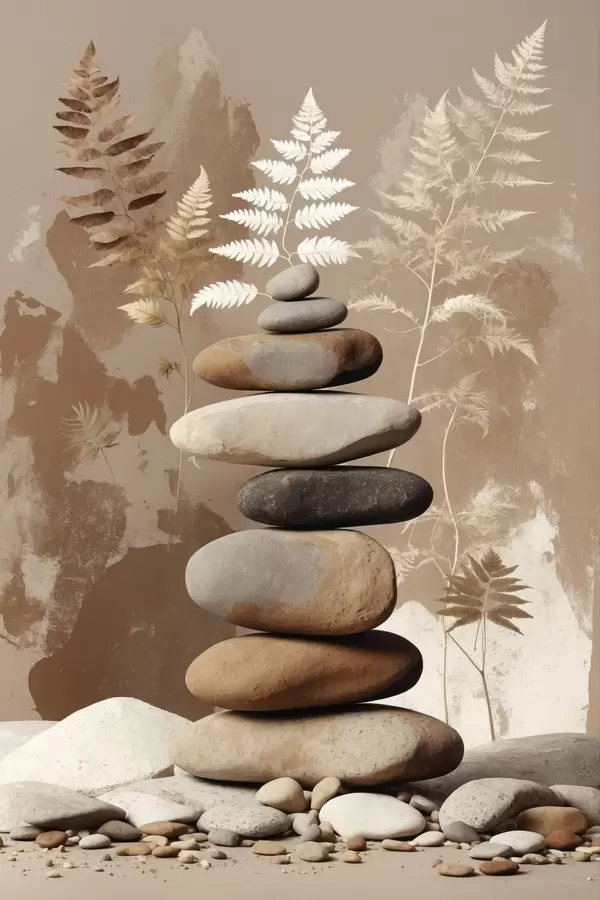Plakat Stos gładkich kamieni na tle roślinności f47764