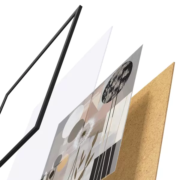 Plakat składa się z ramy, pleksi, wydrukowanego obrazu i podkładu z płyty wiórowej. Plakat można natychmiast zawiesić na ścianie dzięki uchwytom z tyłu.