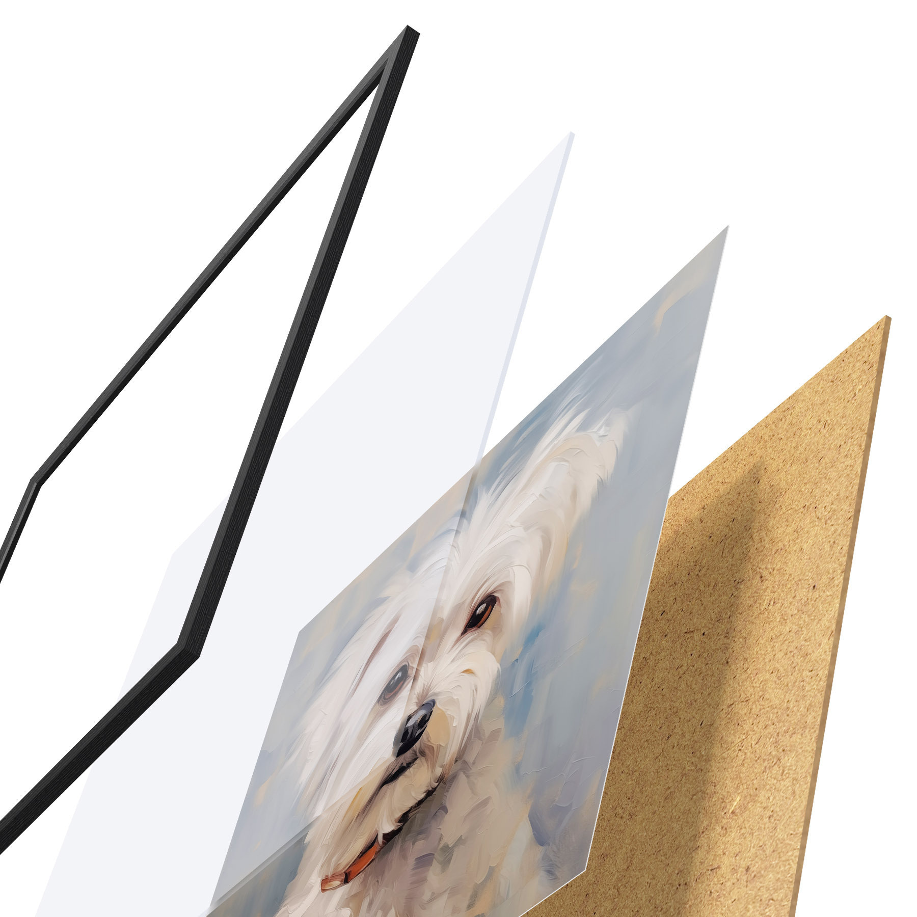 Plakat składa się z ramy, pleksi, wydrukowanego obrazu i podkładu z płyty wiórowej. Plakat można natychmiast zawiesić na ścianie dzięki uchwytom z tyłu.