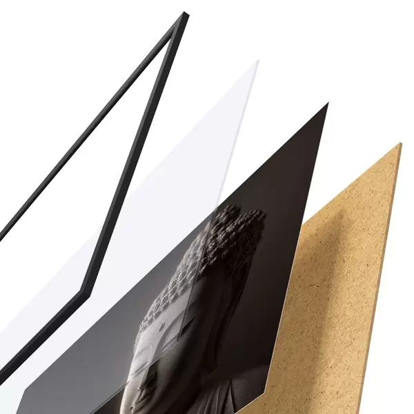 Plakat składa się z ramy, pleksi, wydrukowanego obrazu i podkładu z płyty wiórowej. Plakat można natychmiast zawiesić na ścianie dzięki uchwytom z tyłu.