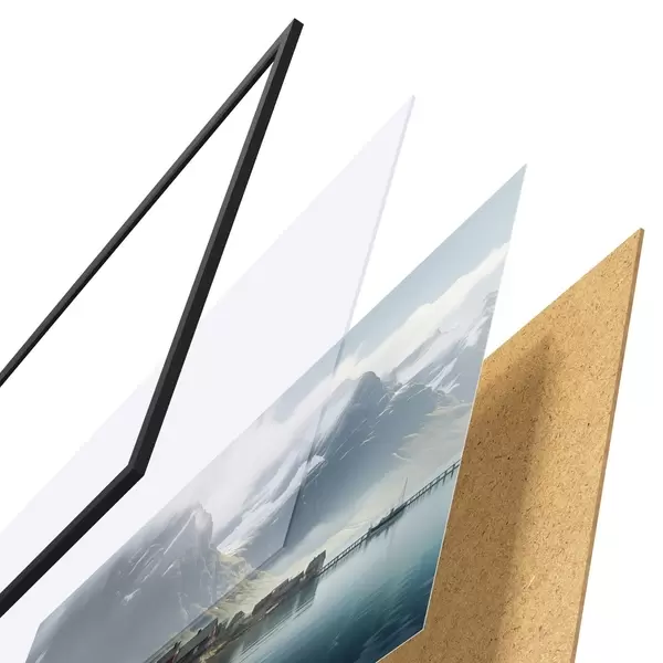 Plakat składa się z ramy, pleksi, wydrukowanego obrazu i podkładu z płyty wiórowej. Plakat można natychmiast zawiesić na ścianie dzięki uchwytom z tyłu.