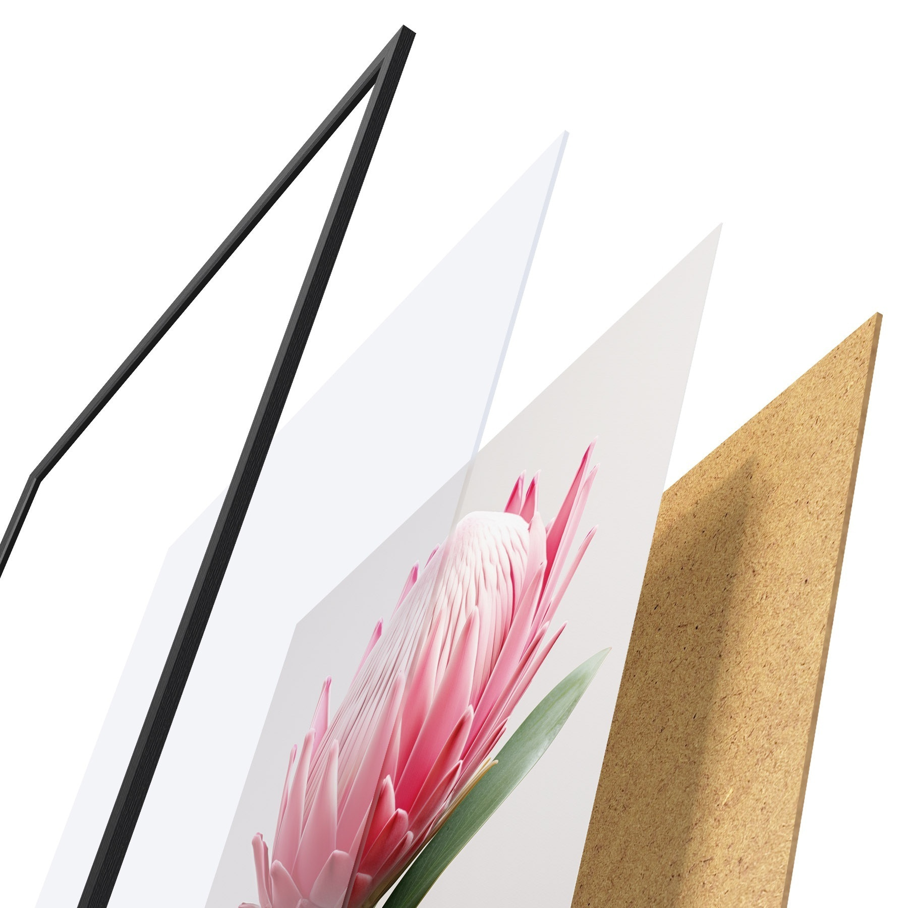 Plakat składa się z ramy, pleksi, wydrukowanego obrazu i podkładu z płyty wiórowej. Plakat można natychmiast zawiesić na ścianie dzięki uchwytom z tyłu.