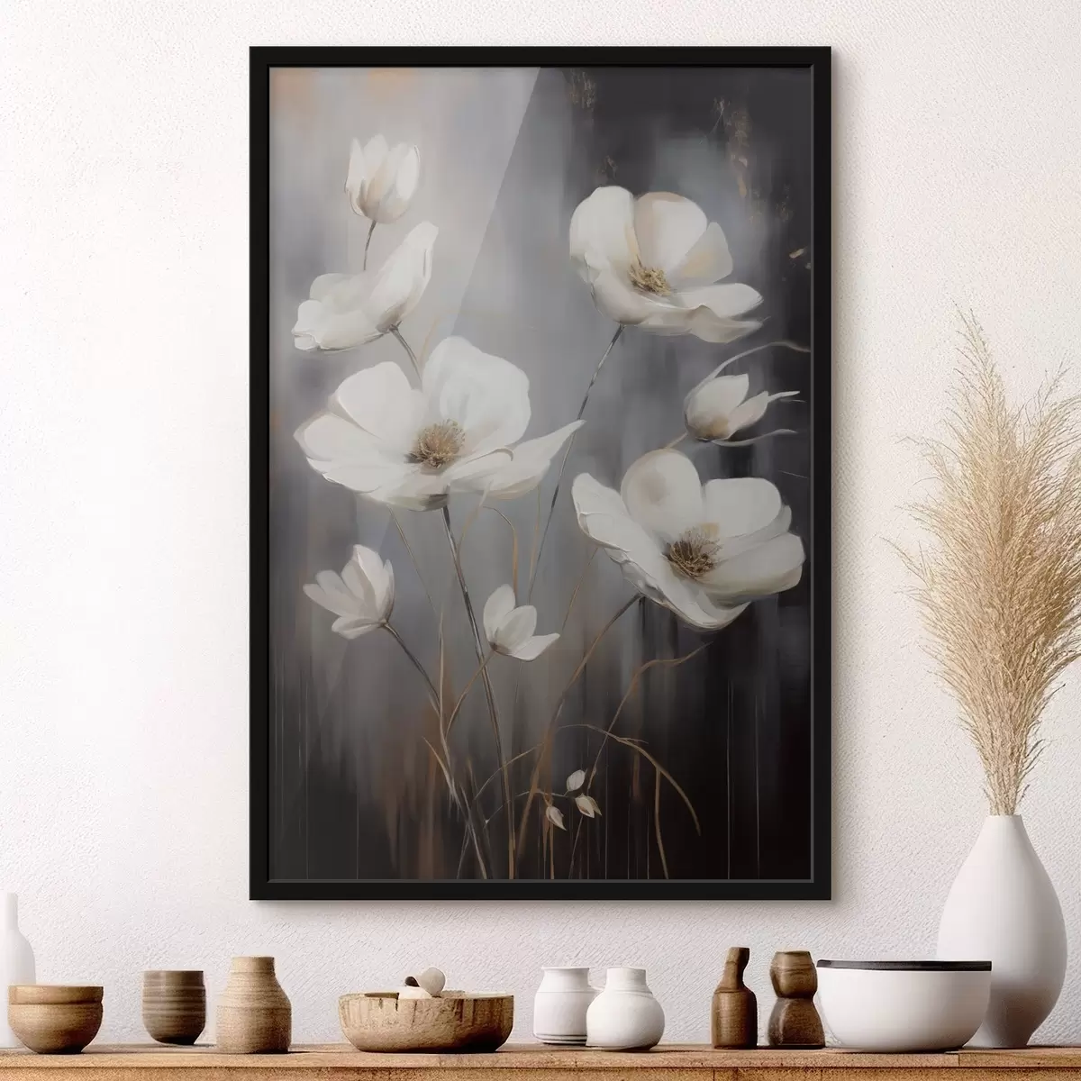 Plakat Białe kwiaty z brązowymi środkami i cienkimi łodygami na ciemnym, teksturowanym tle f47858