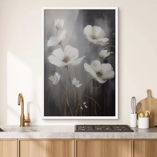 Poster Białe kwiaty z brązowymi środkami i cienkimi łodygami na ciemnym, teksturowanym tle Nr f47858