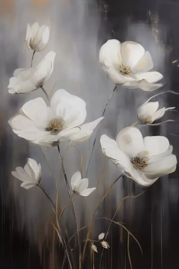Poster Białe kwiaty z brązowymi środkami i cienkimi łodygami na ciemnym, teksturowanym tle Nr f47858