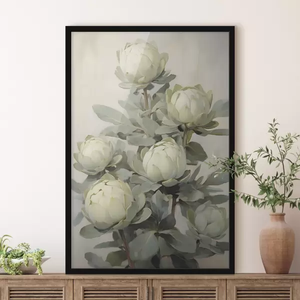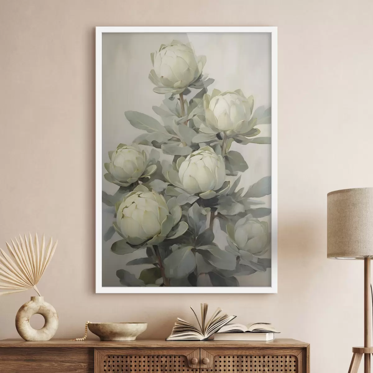 Poster Styl malarski przedstawiający kilka białych kwiatów protei z dużymi zielonymi liśćmi na jasnym tle. Nr f47861