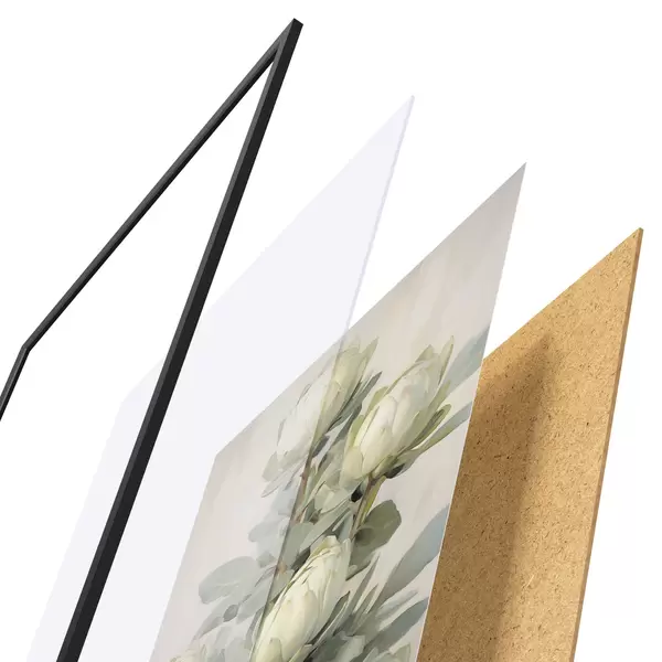 Plakat składa się z ramy, pleksi, wydrukowanego obrazu i podkładu z płyty wiórowej. Plakat można natychmiast zawiesić na ścianie dzięki uchwytom z tyłu.