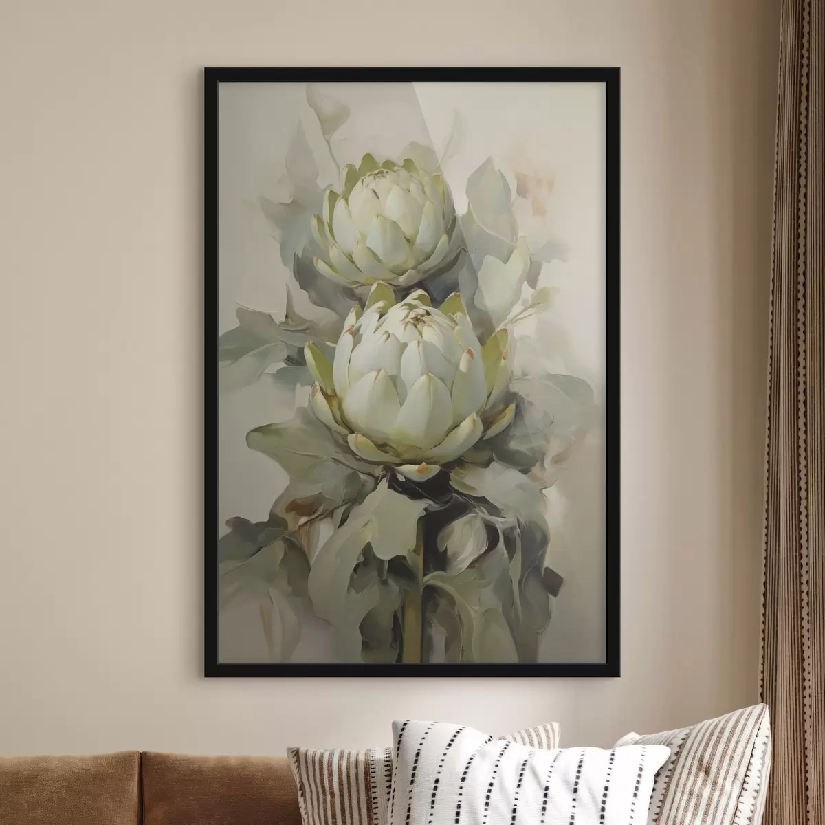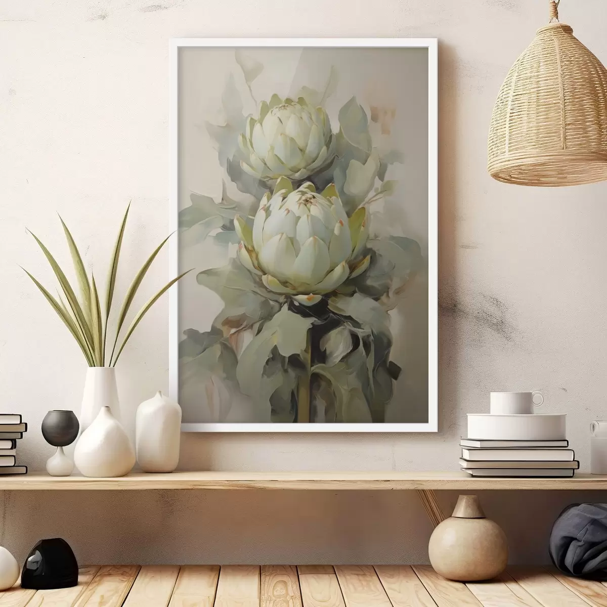 Poster Styl malarski przedstawiający kilka białych kwiatów protei z dużymi zielonymi liśćmi na jasnym tle. Nr f47862