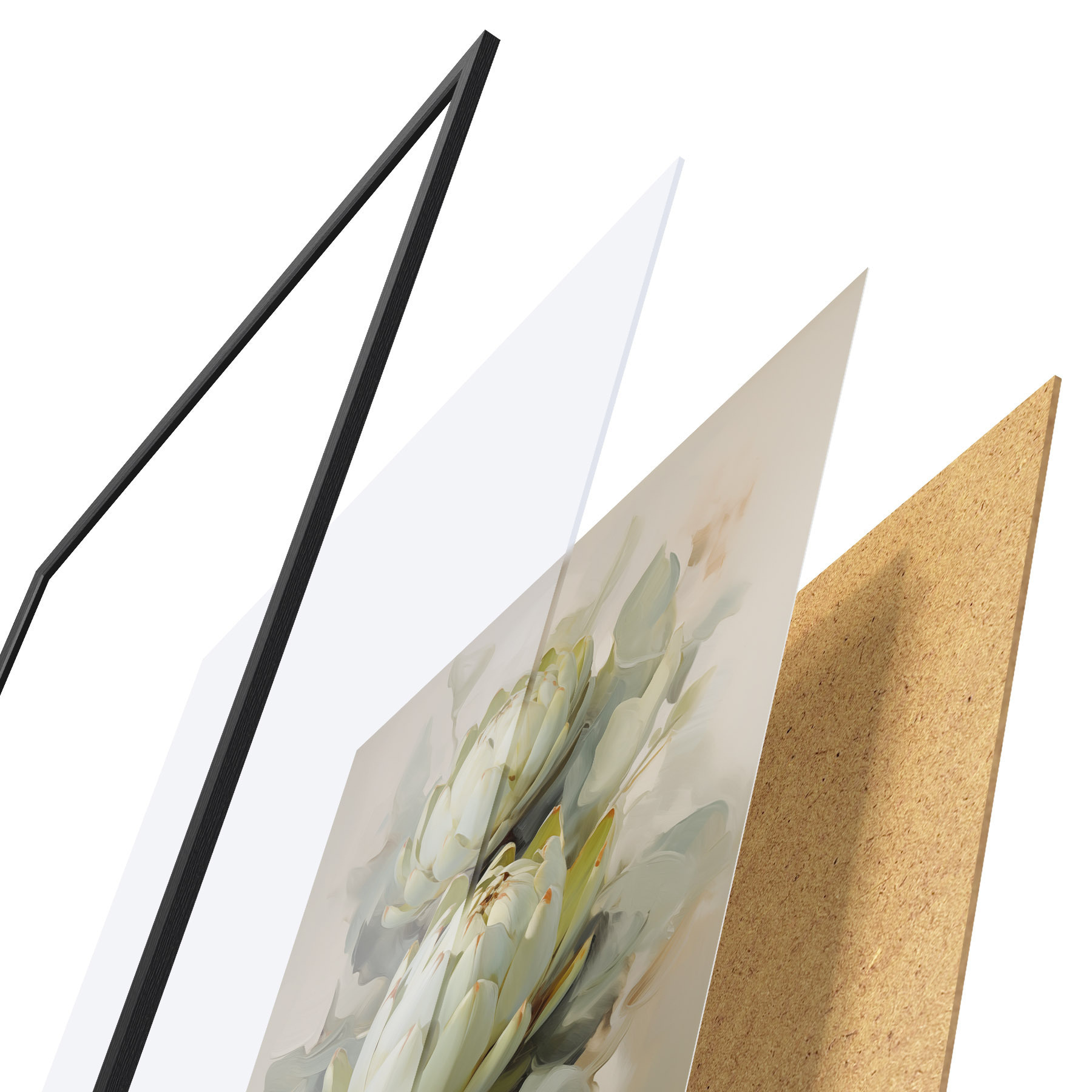 Plakat składa się z ramy, pleksi, wydrukowanego obrazu i podkładu z płyty wiórowej. Plakat można natychmiast zawiesić na ścianie dzięki uchwytom z tyłu.