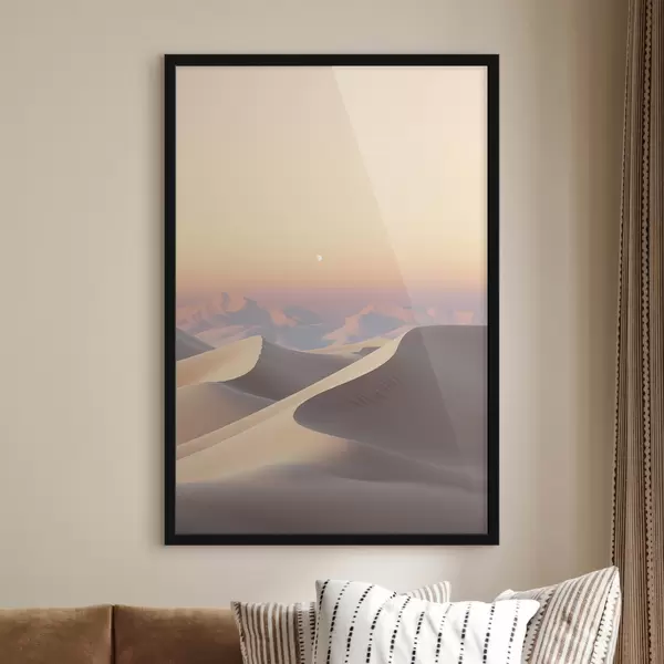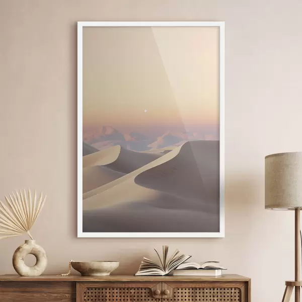 Plakat Pustynny krajobraz z falującymi wydmami pod delikatnym pastelowym niebem, w tle odległe góry. f47865