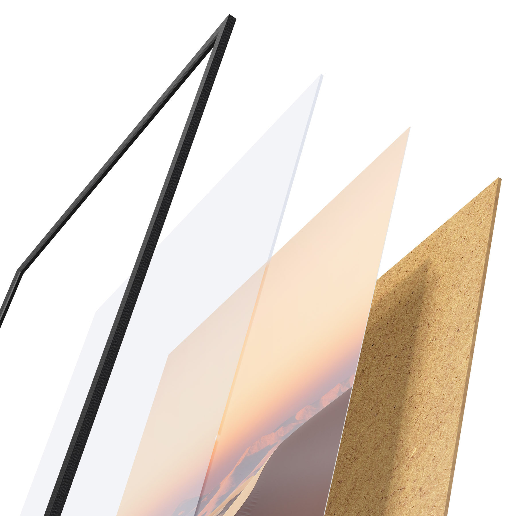 Plakat składa się z ramy, pleksi, wydrukowanego obrazu i podkładu z płyty wiórowej. Plakat można natychmiast zawiesić na ścianie dzięki uchwytom z tyłu.