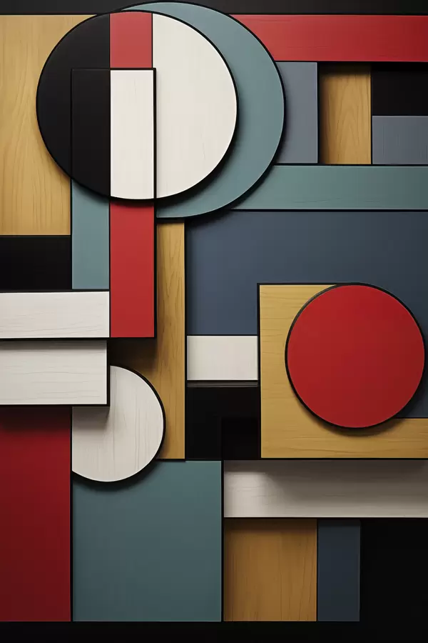 Plakat Abstrakcyjna kompozycja geometryczna z imitacją tekstury drewna, czerwonymi, czarnymi, białymi i turkusowymi prostokątami i okręgami. f47875