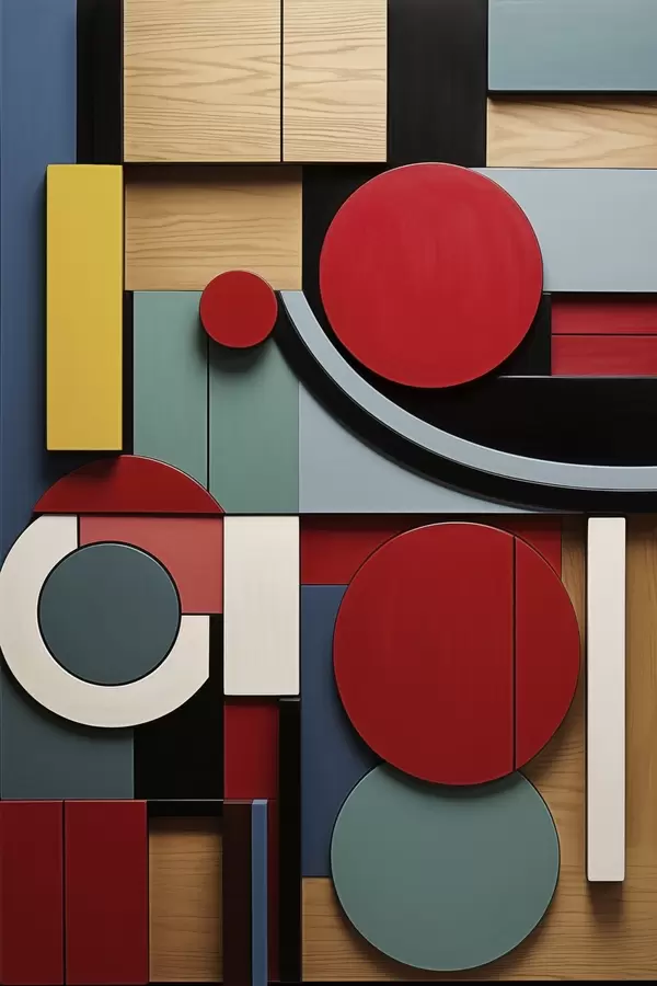 Plakat Abstrakcyjna kompozycja geometryczna z imitacją tekstury drewna, czerwonymi, czarnymi, białymi i turkusowymi prostokątami i okręgami. f47876