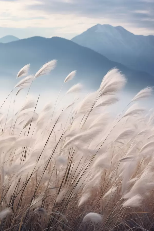 Plakat Wysoka, biała trawa pampasowa kołysząca się na wietrze, a w tle delikatne błękitne góry. f47879