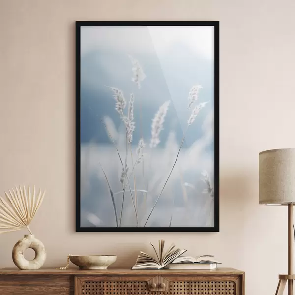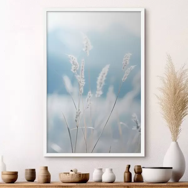 Plakat Biała, puszysta trawa na tle delikatnego błękitnego nieba, z płytką głębią ostrości. f47880