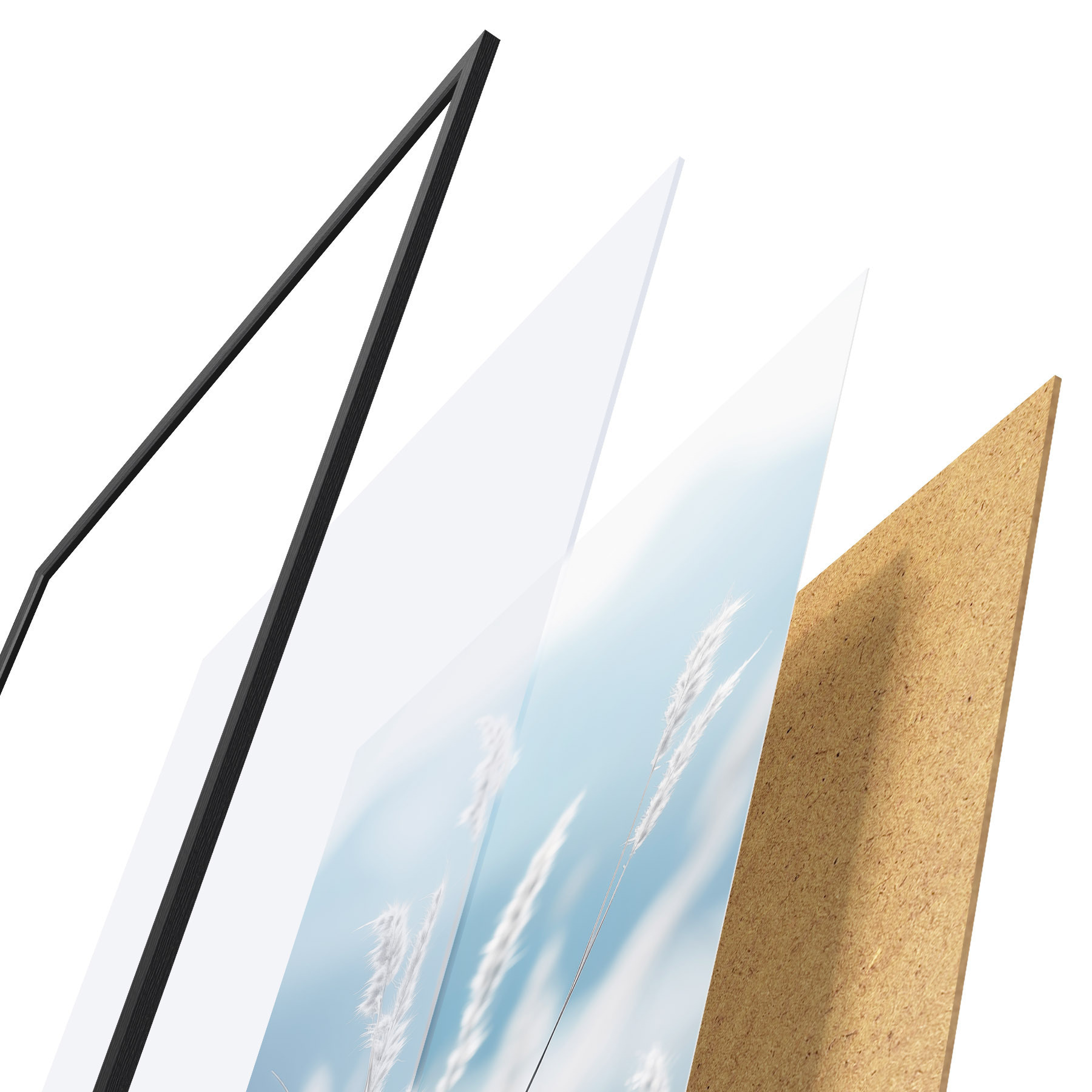 Plakat składa się z ramy, pleksi, wydrukowanego obrazu i podkładu z płyty wiórowej. Plakat można natychmiast zawiesić na ścianie dzięki uchwytom z tyłu.