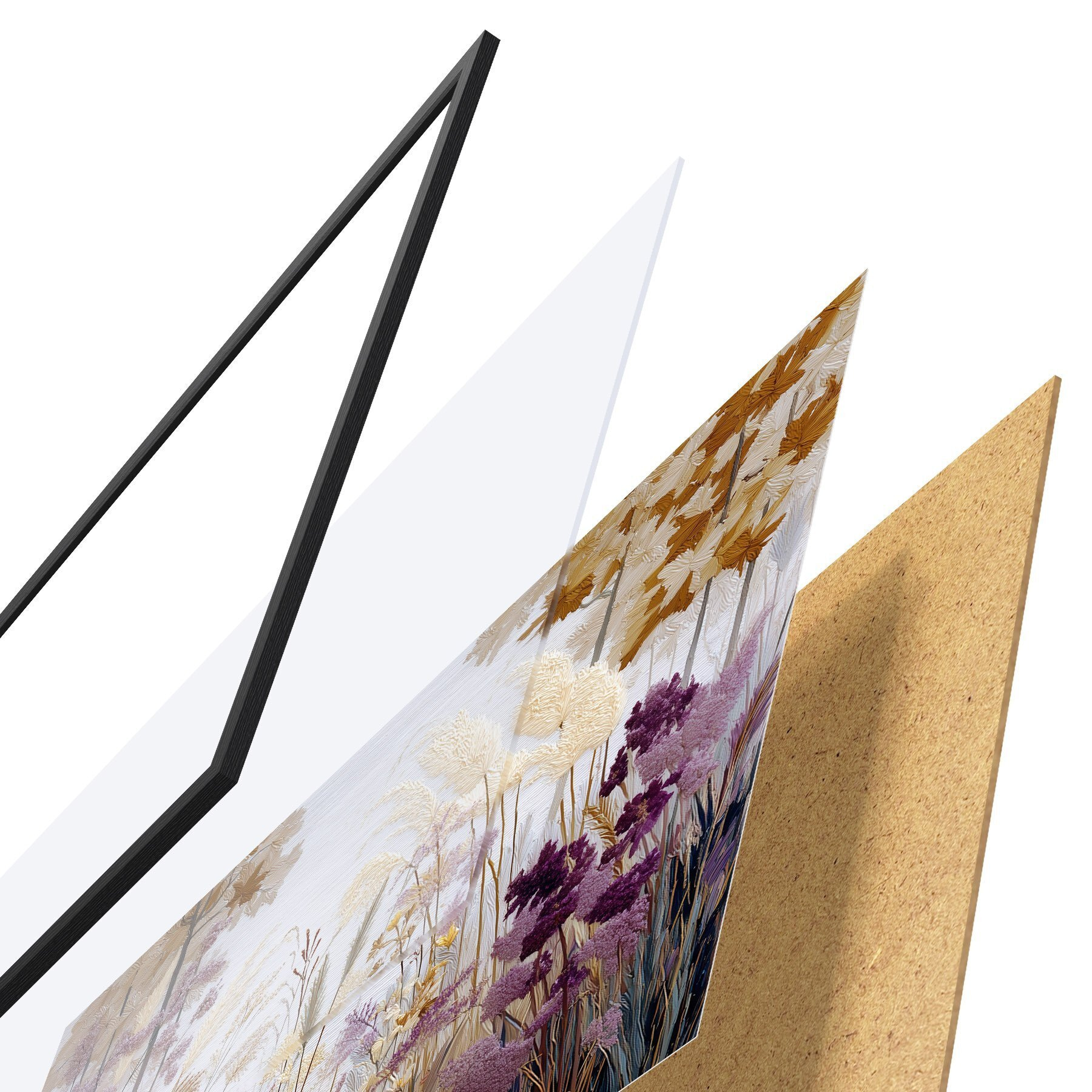Plakat składa się z ramy, pleksi, wydrukowanego obrazu i podkładu z płyty wiórowej. Plakat można natychmiast zawiesić na ścianie dzięki uchwytom z tyłu.