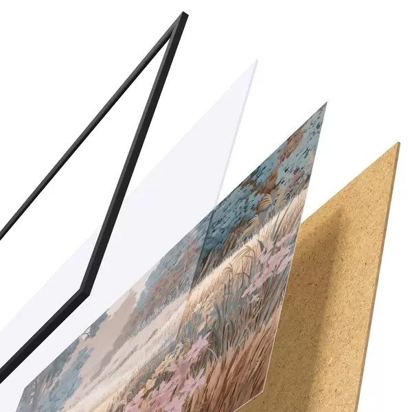 Plakat składa się z ramy, pleksi, wydrukowanego obrazu i podkładu z płyty wiórowej. Plakat można natychmiast zawiesić na ścianie dzięki uchwytom z tyłu.