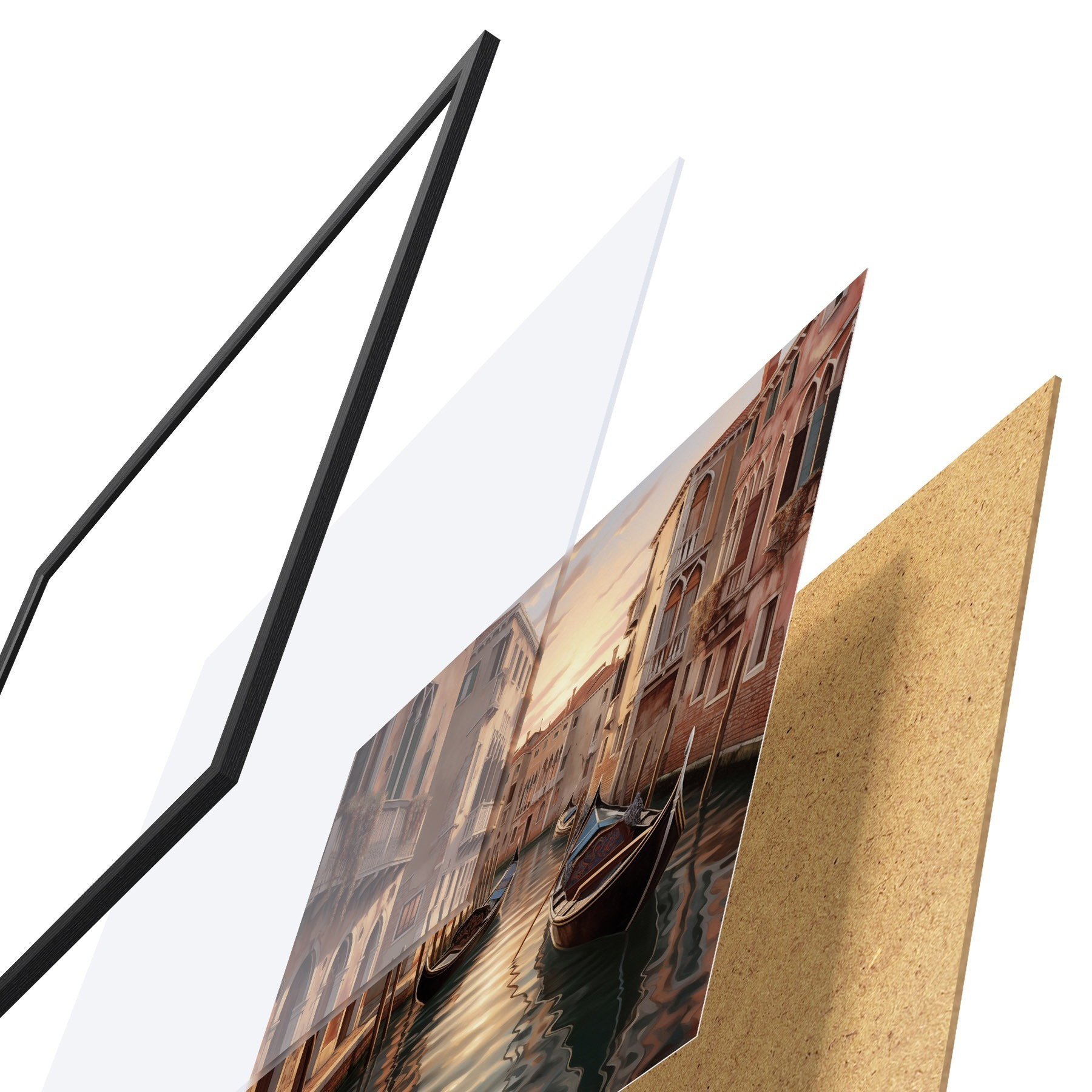 Plakat składa się z ramy, pleksi, wydrukowanego obrazu i podkładu z płyty wiórowej. Plakat można natychmiast zawiesić na ścianie dzięki uchwytom z tyłu.