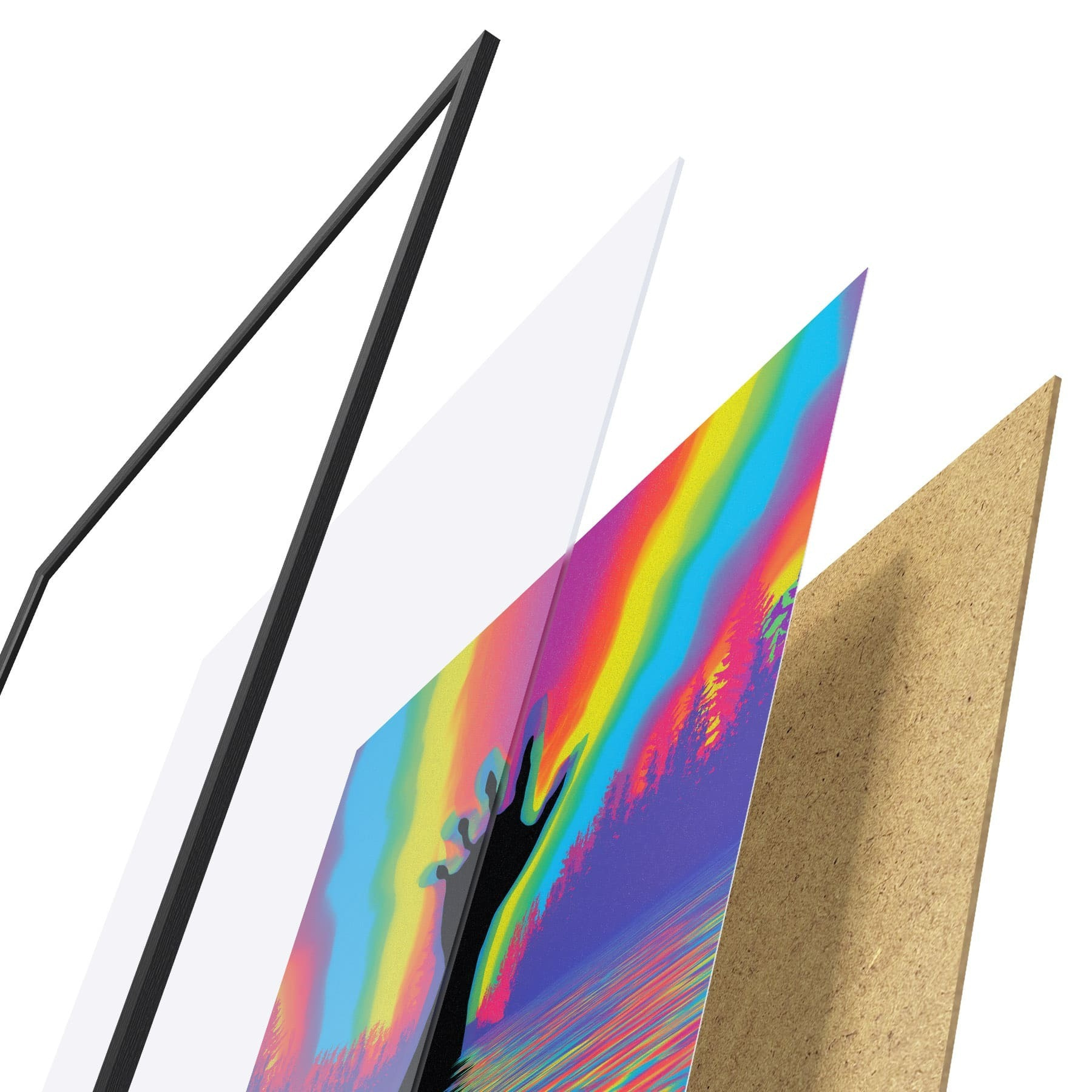 Plakat składa się z ramy, pleksi, wydrukowanego obrazu i podkładu z płyty wiórowej. Plakat można natychmiast zawiesić na ścianie dzięki uchwytom z tyłu.