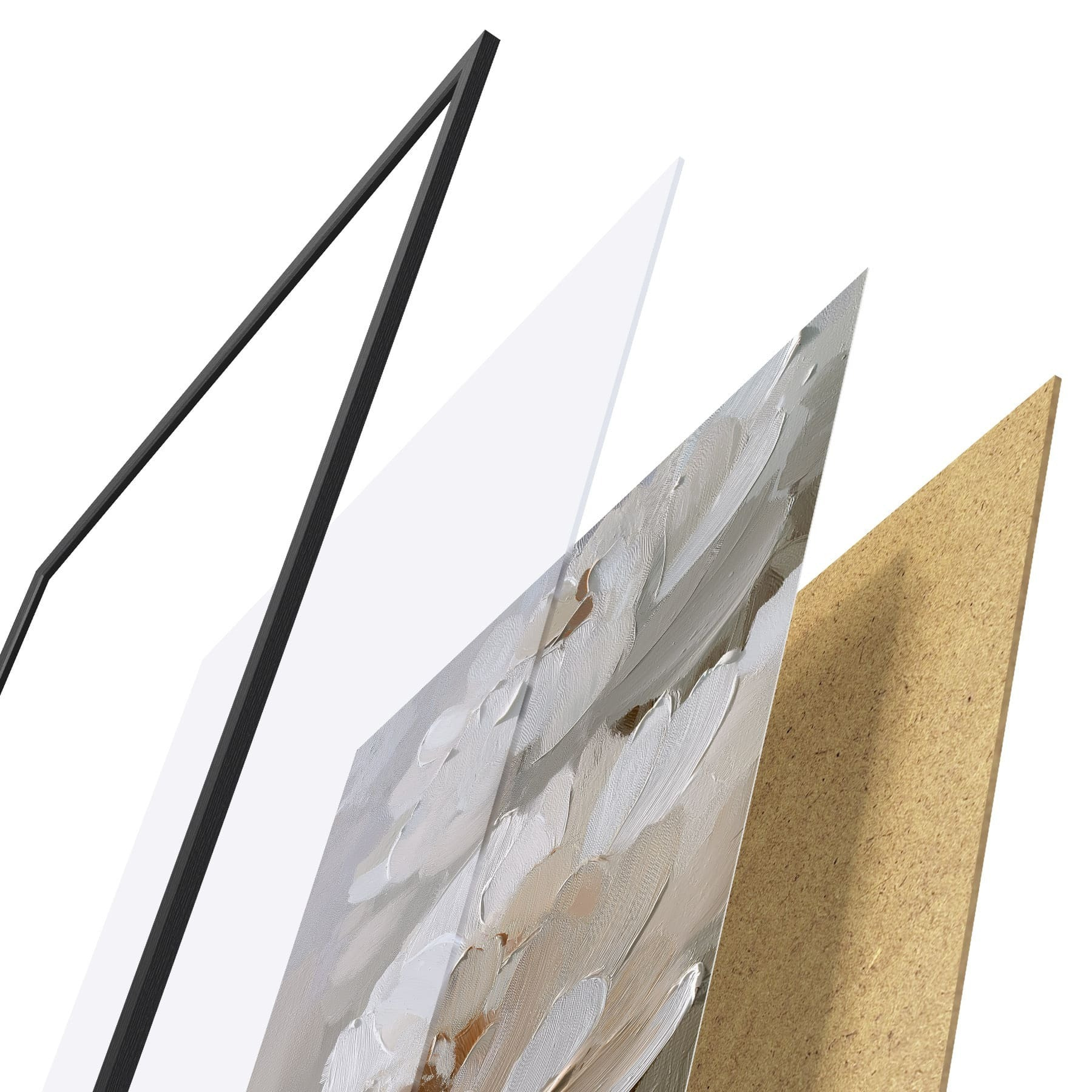 Plakat składa się z ramy, pleksi, wydrukowanego obrazu i podkładu z płyty wiórowej. Plakat można natychmiast zawiesić na ścianie dzięki uchwytom z tyłu.