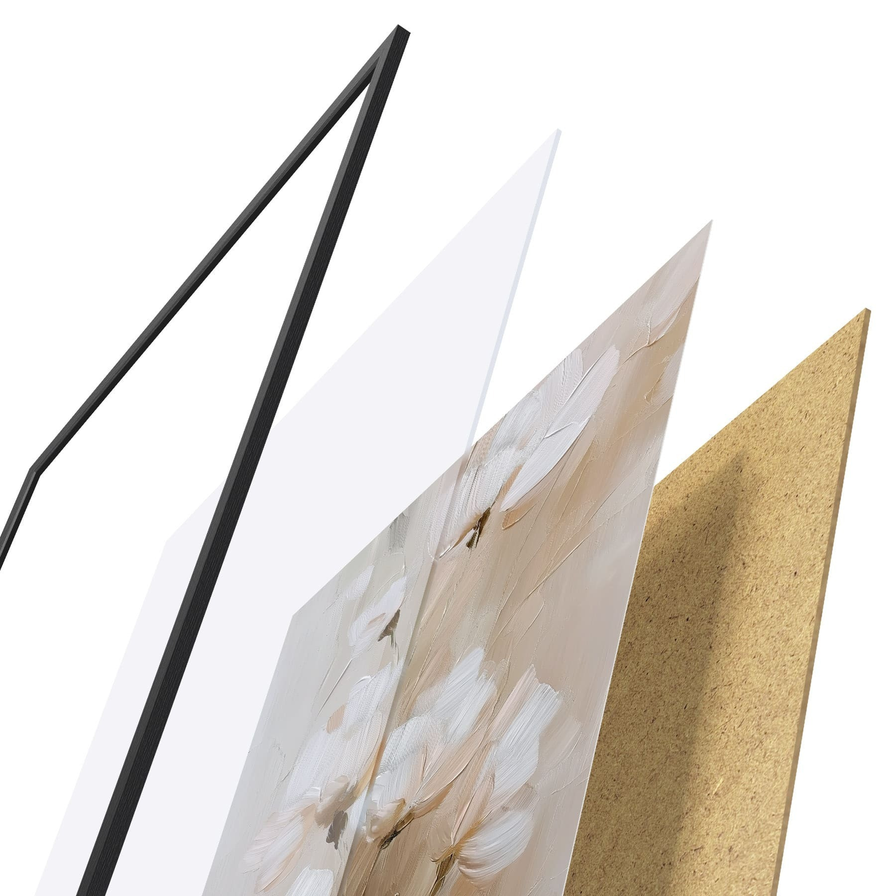 Plakat składa się z ramy, pleksi, wydrukowanego obrazu i podkładu z płyty wiórowej. Plakat można natychmiast zawiesić na ścianie dzięki uchwytom z tyłu.