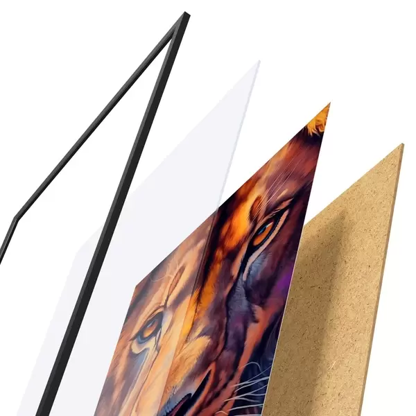 Plakat składa się z ramy, pleksi, wydrukowanego obrazu i podkładu z płyty wiórowej. Plakat można natychmiast zawiesić na ścianie dzięki uchwytom z tyłu.
