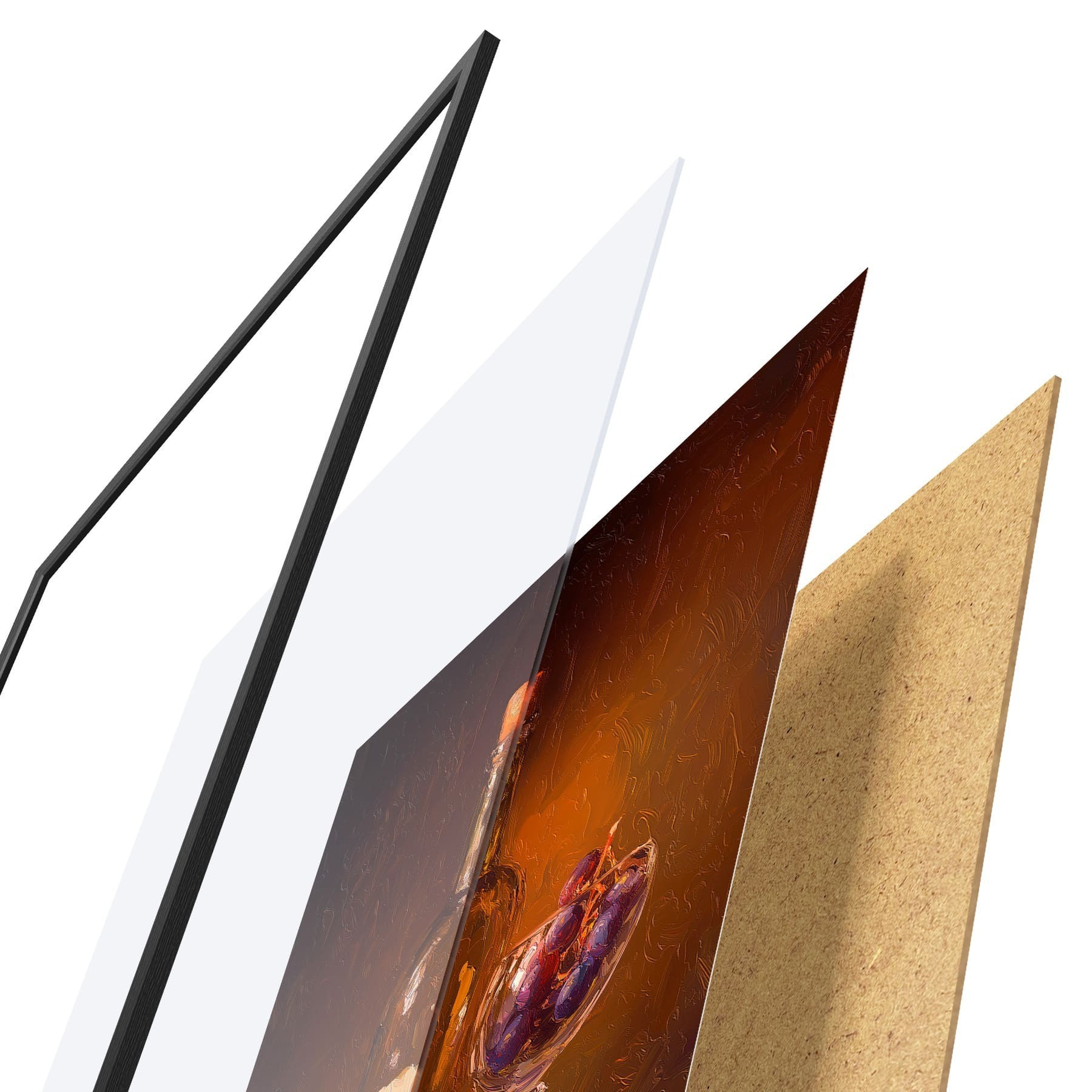 Plakat składa się z ramy, pleksi, wydrukowanego obrazu i podkładu z płyty wiórowej. Plakat można natychmiast zawiesić na ścianie dzięki uchwytom z tyłu.