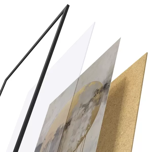 Plakat składa się z ramy, pleksi, wydrukowanego obrazu i podkładu z płyty wiórowej. Plakat można natychmiast zawiesić na ścianie dzięki uchwytom z tyłu.