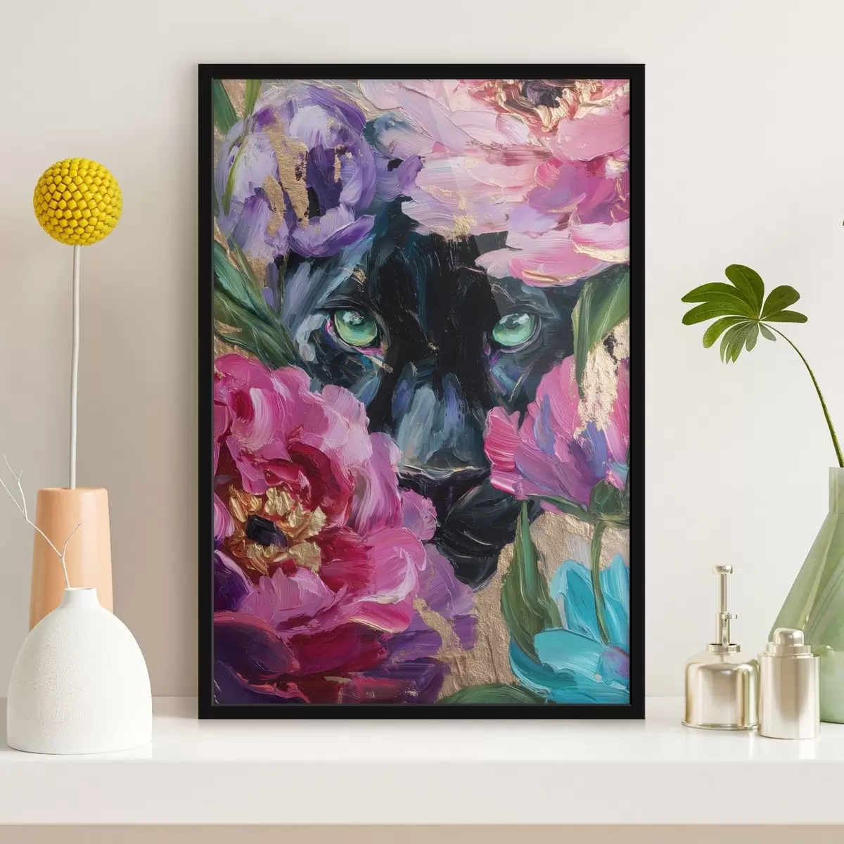 Plakat czarna pantera wygląda spośród piwonii f47936
