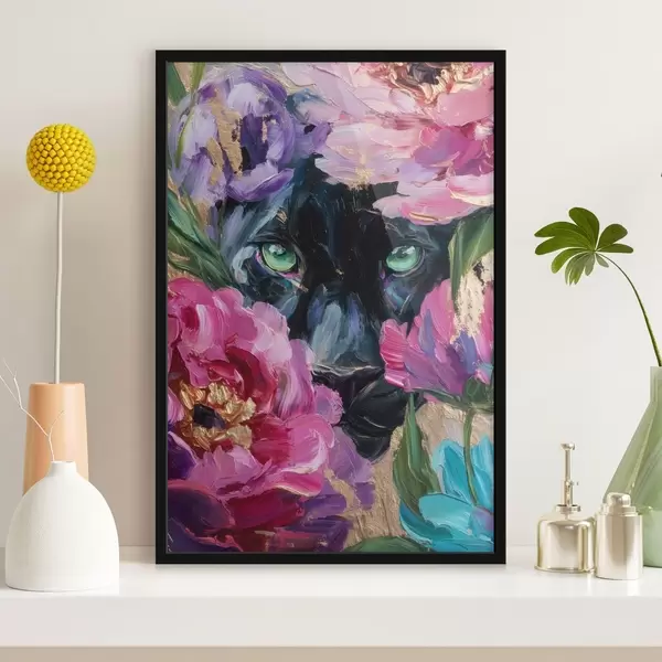 Poster czarna pantera wygląda spośród piwonii Nr f47936
