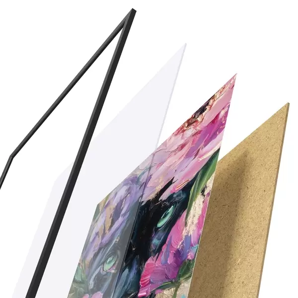 Plakat składa się z ramy, pleksi, wydrukowanego obrazu i podkładu z płyty wiórowej. Plakat można natychmiast zawiesić na ścianie dzięki uchwytom z tyłu.