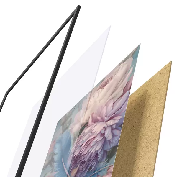 Plakat składa się z ramy, pleksi, wydrukowanego obrazu i podkładu z płyty wiórowej. Plakat można natychmiast zawiesić na ścianie dzięki uchwytom z tyłu.