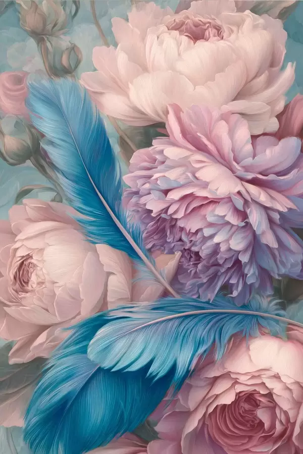 Plakat pióra wśród piwonii f47939