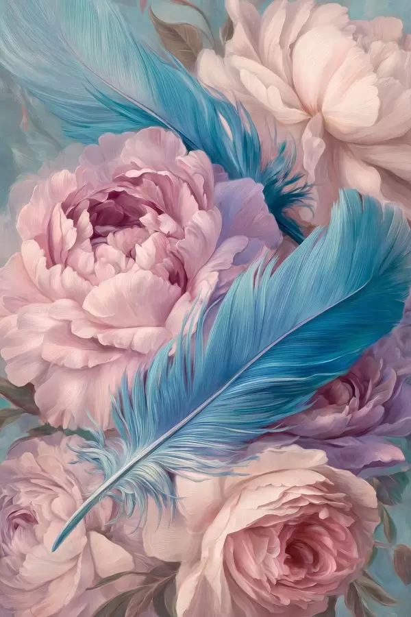 Plakat pióra wśród piwonii f47940