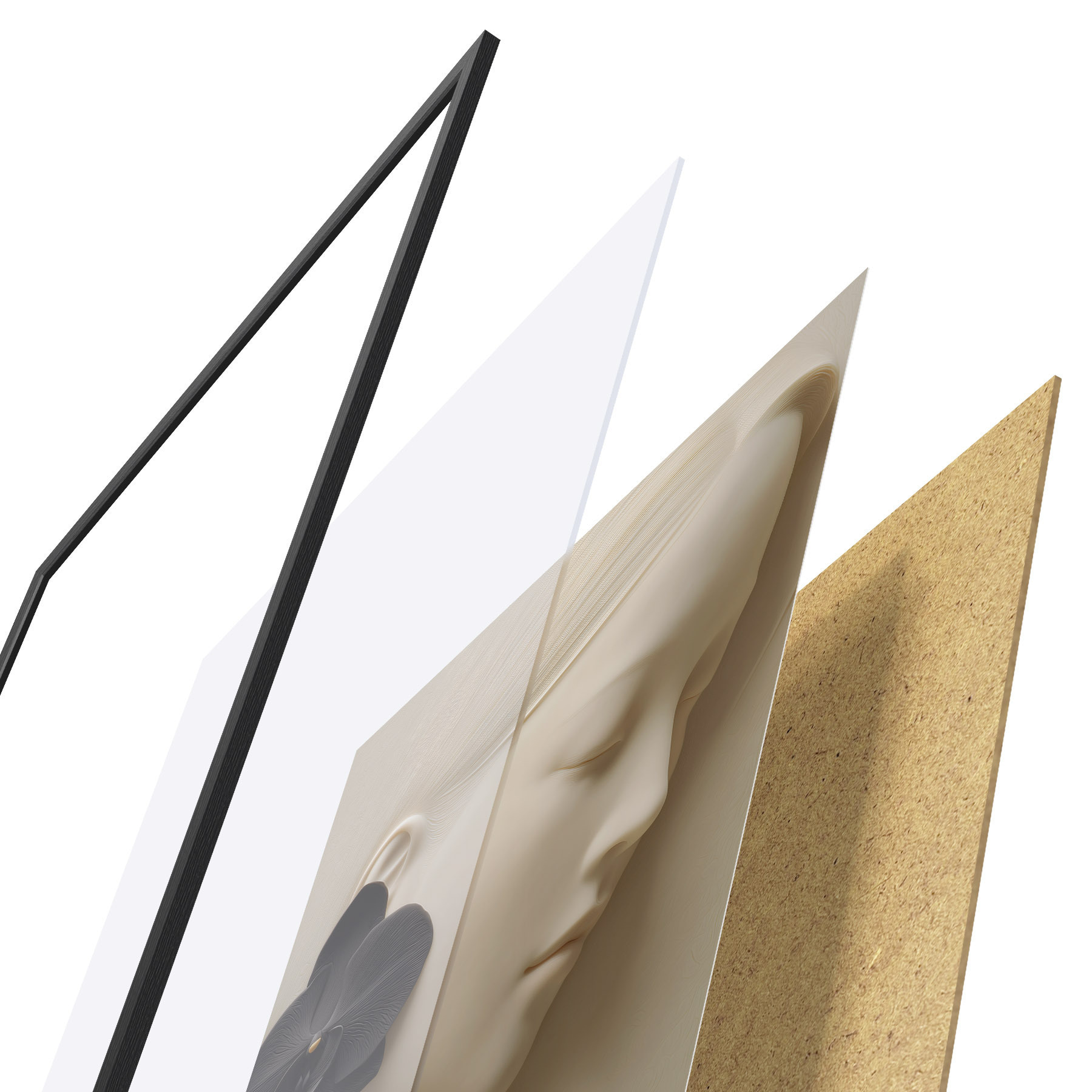 Plakat składa się z ramy, pleksi, wydrukowanego obrazu i podkładu z płyty wiórowej. Plakat można natychmiast zawiesić na ścianie dzięki uchwytom z tyłu.