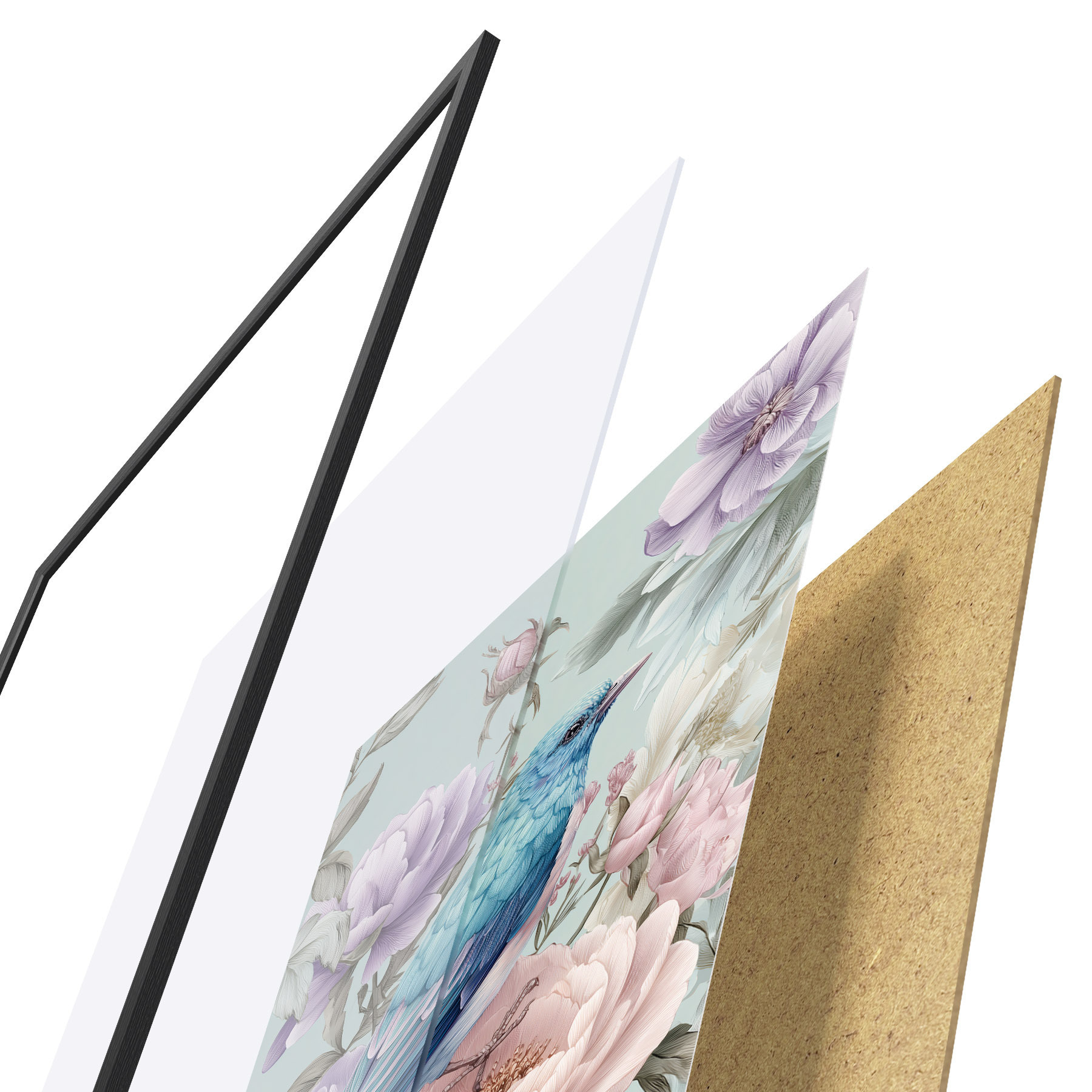 Plakat składa się z ramy, pleksi, wydrukowanego obrazu i podkładu z płyty wiórowej. Plakat można natychmiast zawiesić na ścianie dzięki uchwytom z tyłu.