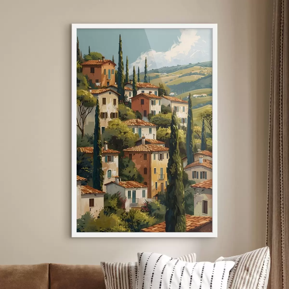 Plakat śródziemnomorska wioska na wzgórzu, domy w ciepłych kolorach z dachami z terakoty f47950