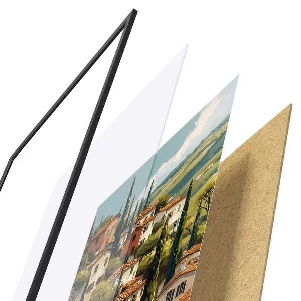 Plakat składa się z ramy, pleksi, wydrukowanego obrazu i podkładu z płyty wiórowej. Plakat można natychmiast zawiesić na ścianie dzięki uchwytom z tyłu.