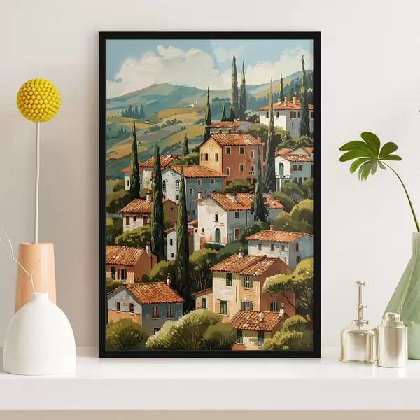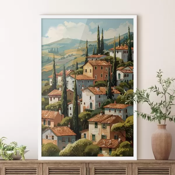 Plakat śródziemnomorska wioska na wzgórzu, domy w ciepłych kolorach z dachami z terakoty f47951