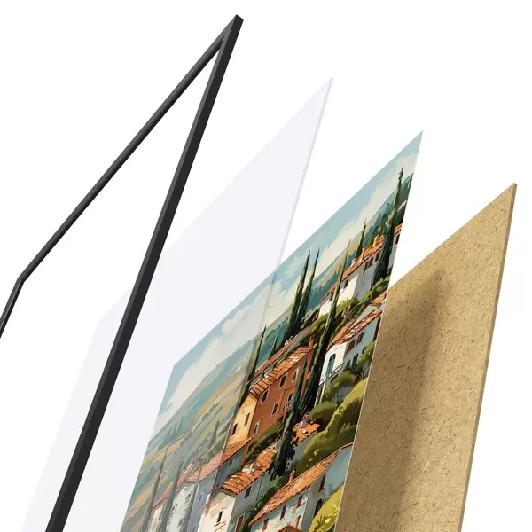 Plakat składa się z ramy, pleksi, wydrukowanego obrazu i podkładu z płyty wiórowej. Plakat można natychmiast zawiesić na ścianie dzięki uchwytom z tyłu.