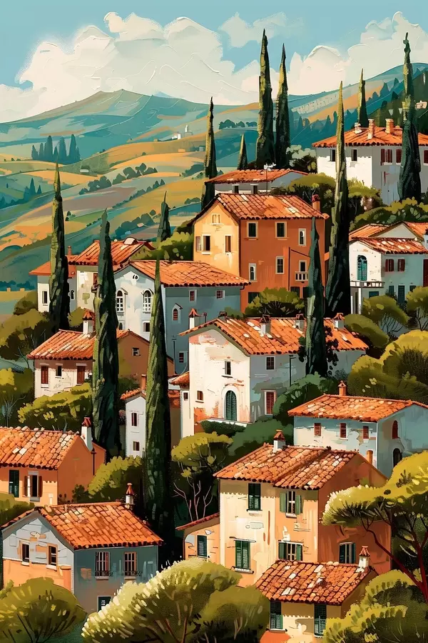 Plakat śródziemnomorska wioska na wzgórzu, domy w ciepłych kolorach z dachami z terakoty f47951