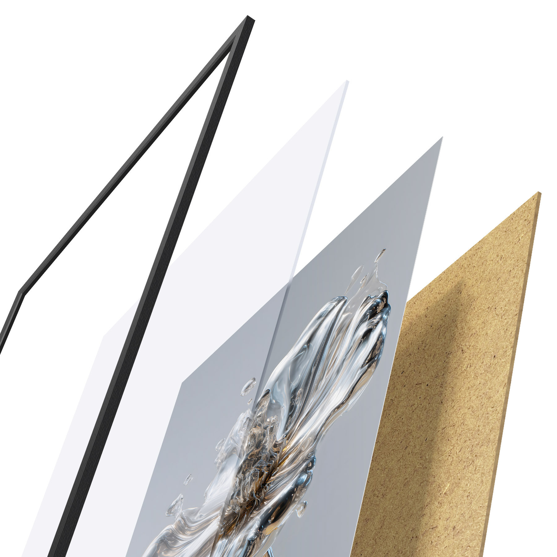 Plakat składa się z ramy, pleksi, wydrukowanego obrazu i podkładu z płyty wiórowej. Plakat można natychmiast zawiesić na ścianie dzięki uchwytom z tyłu.